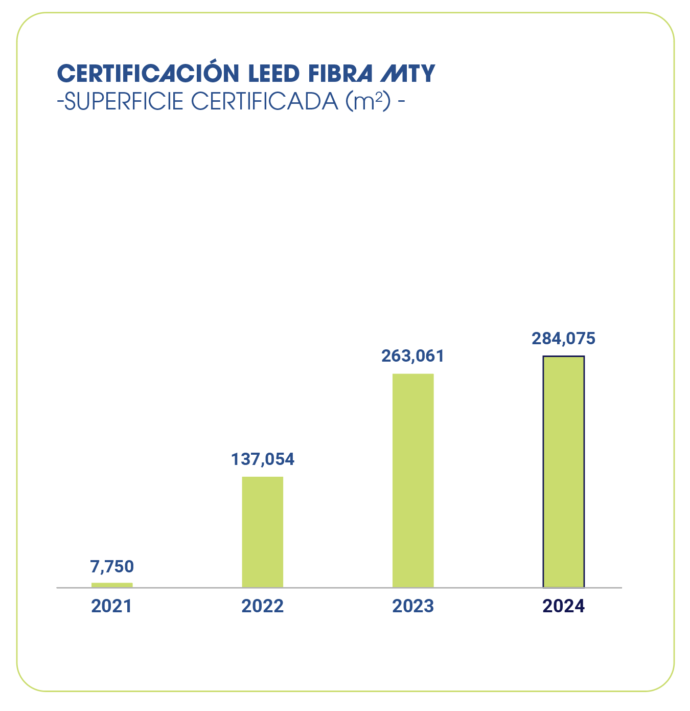 Al 31 de diciembre de 2024, Fibra Mty cuenta con 19 edificios certificados LEED que comprenden 10 edificios de oficinas y un edificio comercial certificados LEED O+M (Operations and Maintenance), así como 8 edificios industriales certificados LEED BD+C: Core & Shell y 1 edificio industrial con certificado LEED BD+C: WDC. Los detalles de cada inmueble certificado están disponibles en https://www.usgbc.org/projects
